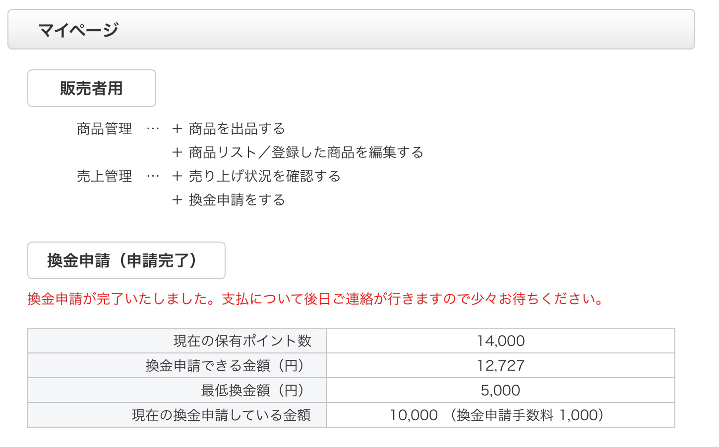 売り上げ金額が「換金申請できる金額」に到達している場合、換金申請が行えます。